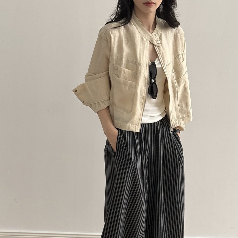 シアーショート丈ジャケット ■商品説明 ライダース風のデザインながらシアーな生地とゆったりとしたシルエットで女性らしさをプラスしたジャケット。コンパクトな着丈でパンツはもちろんスカートにも合わせやすい着丈です。 ■カラー ホワイト ベージュ ■サイズ(cm) M 着丈48/バスト90/肩幅45/袖丈56 L 着丈49/バスト94/肩幅46/袖丈57 ※採寸には1〜4cmほどの誤差がある場合がございます。 ■素材 リヨセル ポリエステル アセテート リネン ☆インスタで他のアイテムもチェック! https://www.instagram.com/_riglow_official_/ ☆riglowで今人気のアイテムはこれ! https://www.riglow.net/categories/3447320 ☆Shop top pageはこちらから https://www.riglow.net/ ----------------------------------------------------------------------------------- 【お支払い方法について】 ・クレジットカード決済(手数料がかからずオススメです。) ・キャリア決済(docomo/au/Softbank/Y!mobile 手数料300円) ・PayIDあと払い(手数料350円) ※お支払い方法の種類が変更になる可能性がございます。 【お届けについて】 riglowではお客様からご注文をいただき、1点ずつ取り寄せさせていただいております。 そのためご注文(ご入金)いただいてから10日〜3週間前後で発送致します。ご了承ください。 【注意事項】 ・タイミングによっては 商品在庫切れにより注文キャンセルとさせていただくこともございますので、予めご了承くださいませ。 ・こちらは輸入品となります。日本製とは検品基準が異なる為、新品未使用品でもごくわずかな汚れや傷がある場合もございます。 ・商品の色味は、お手持ちのスマートフォンの画面によって実物と若干異なる場合がございます。 ・イメージ違いやサイズ交換等、お客さまご都合による交換、返品は対応出来かねます。ご了承ください。 ※こちらに重要事項を詳しく記載しております。ご購入前にこちらをお読みください。 https://www.riglow.net/about