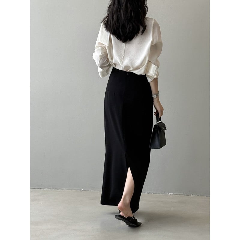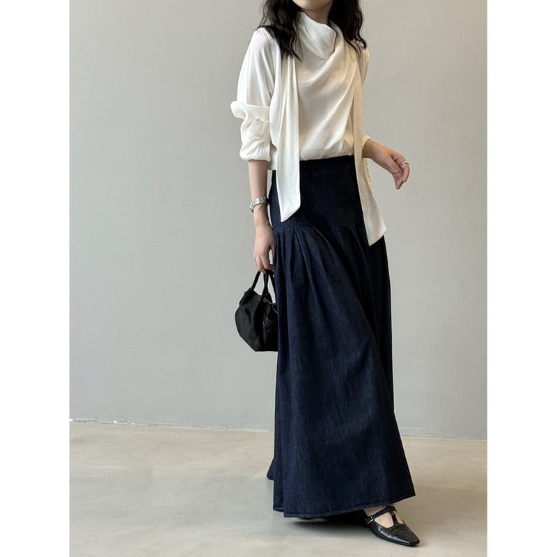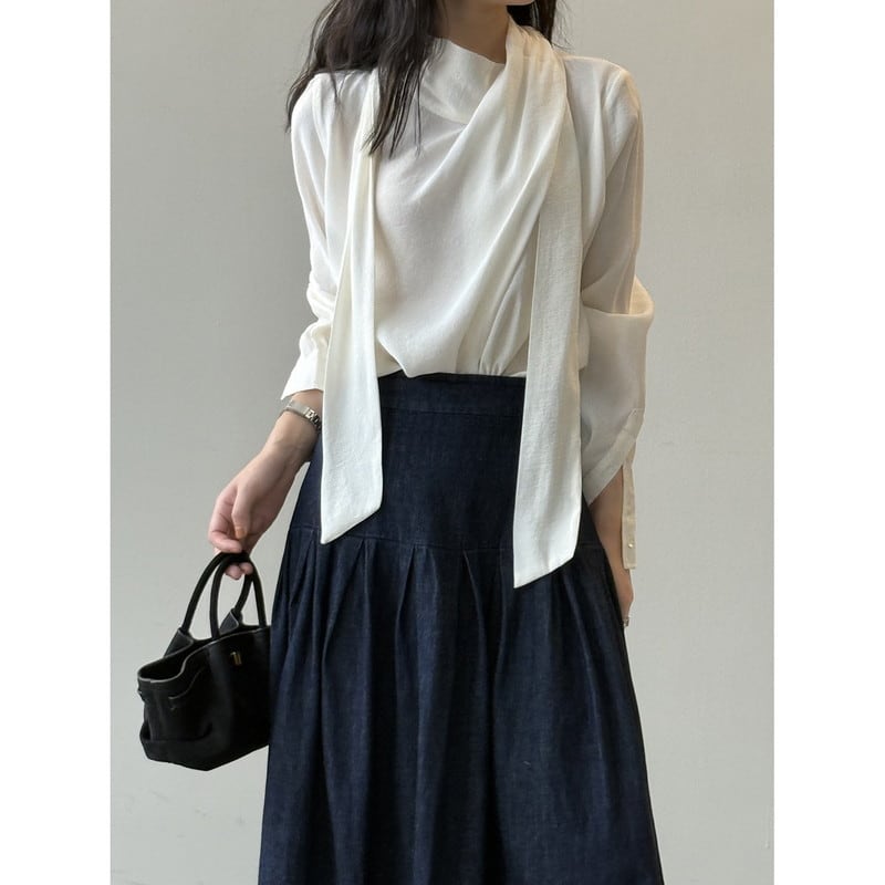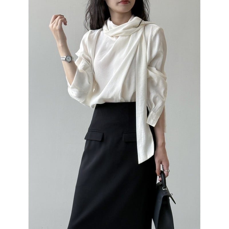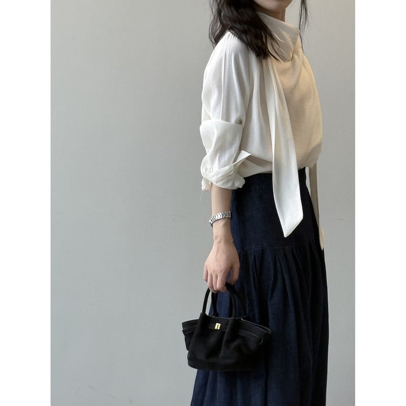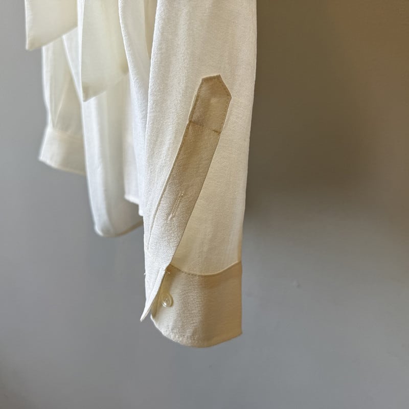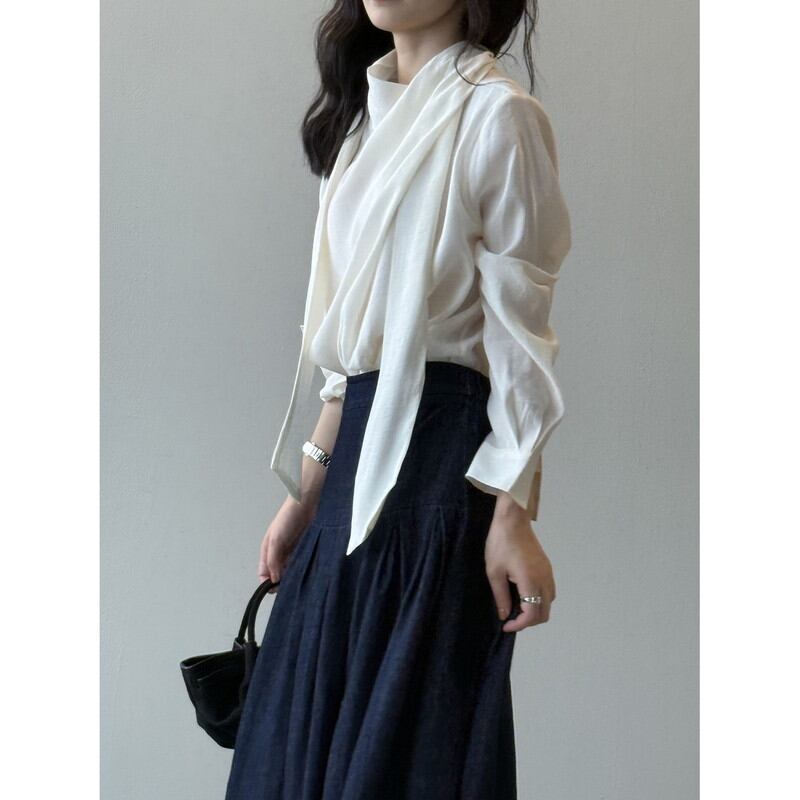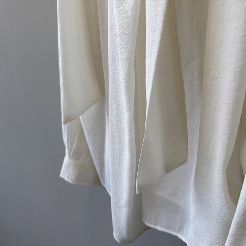 襟元のリボンはそのまま垂らしてボウタイ風にしたり、リボンで結んだりと雰囲気を変えて楽しめなす。
