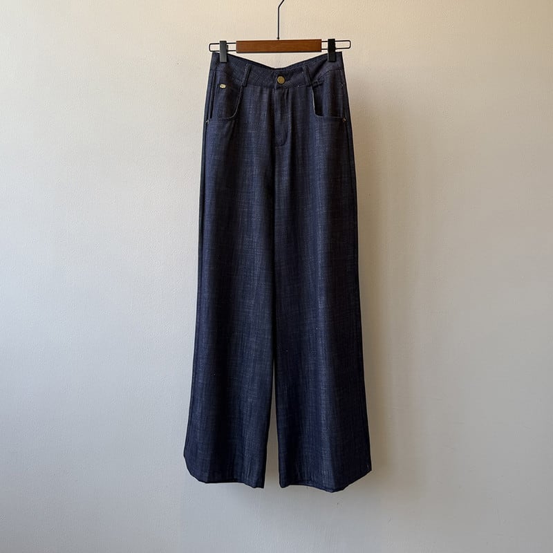 ウエストから大きく広がるワイドレッグデザインが魅力のデニムパンツ。