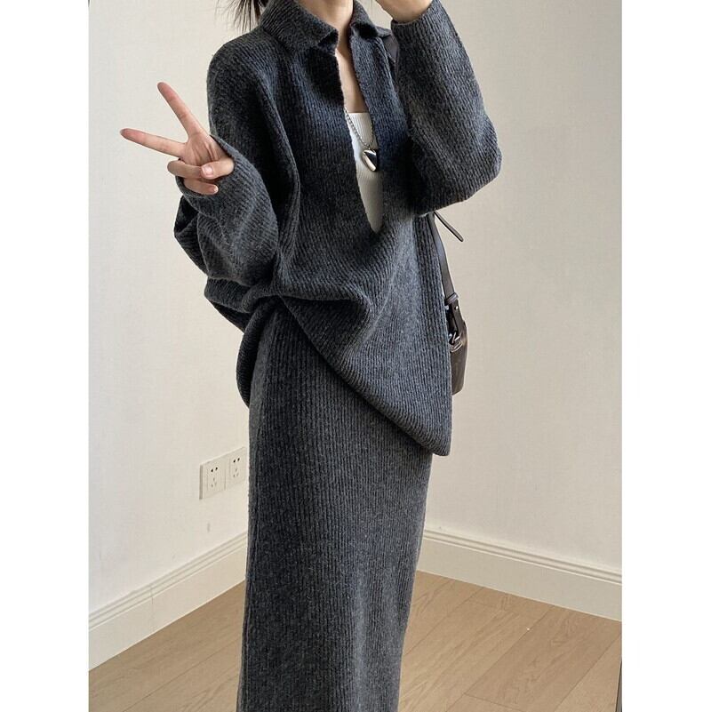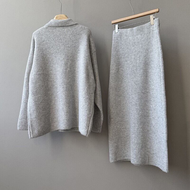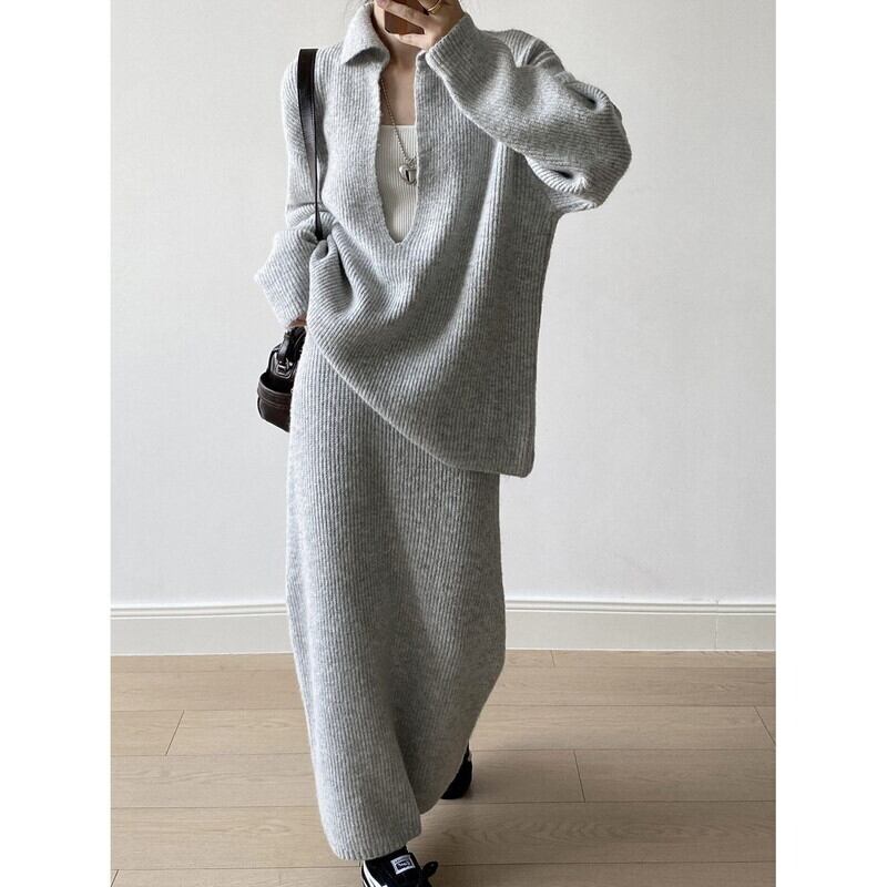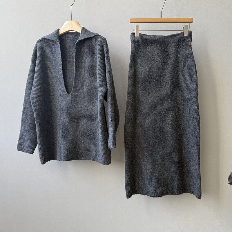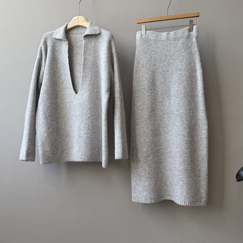 knit v-neck pullover and tight skirt set 102948