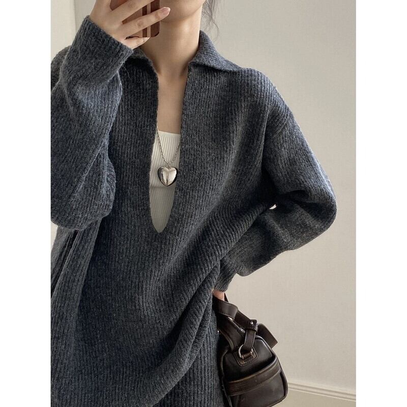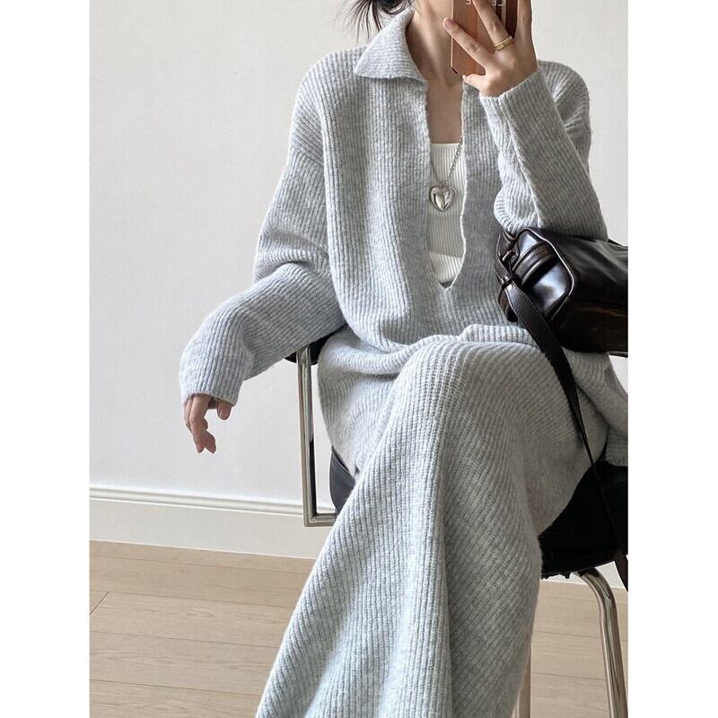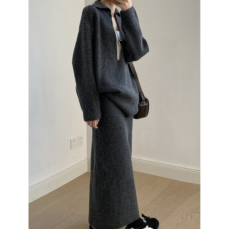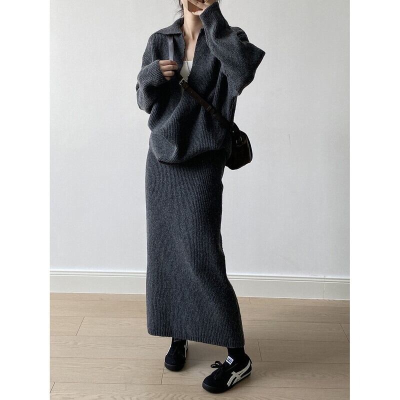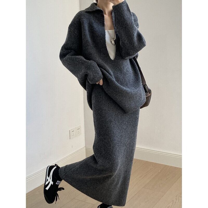 knit v-neck pullover and tight skirt set 102948