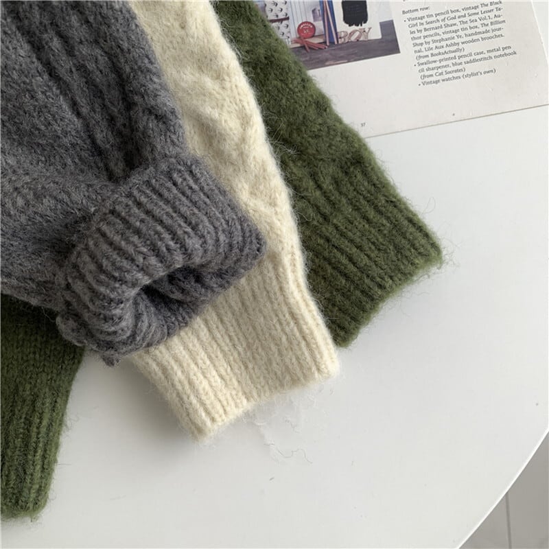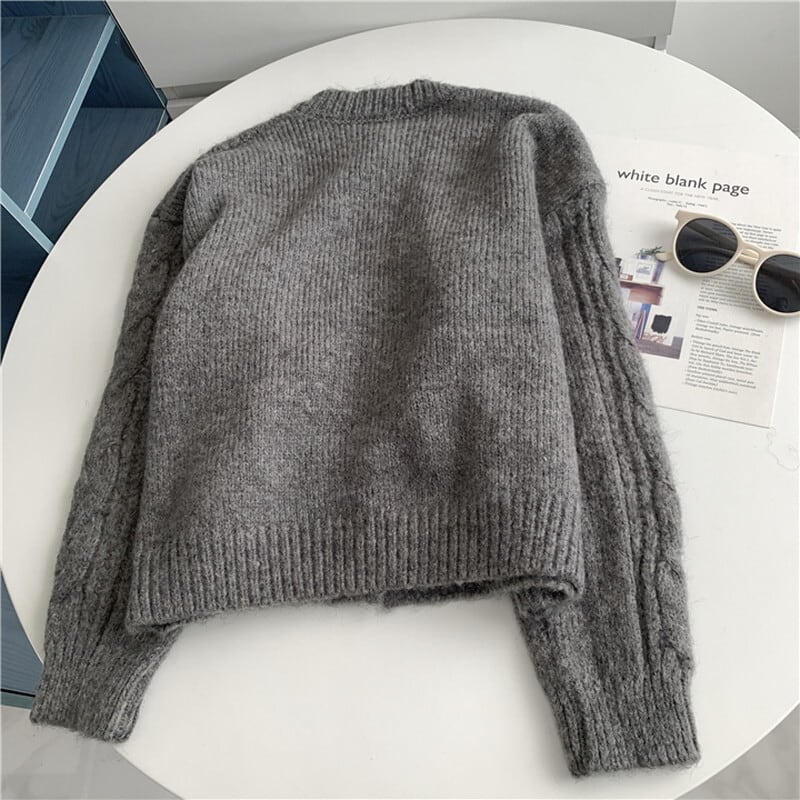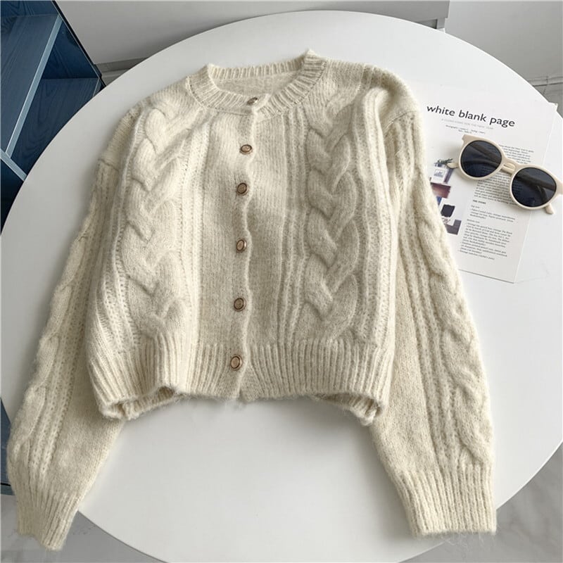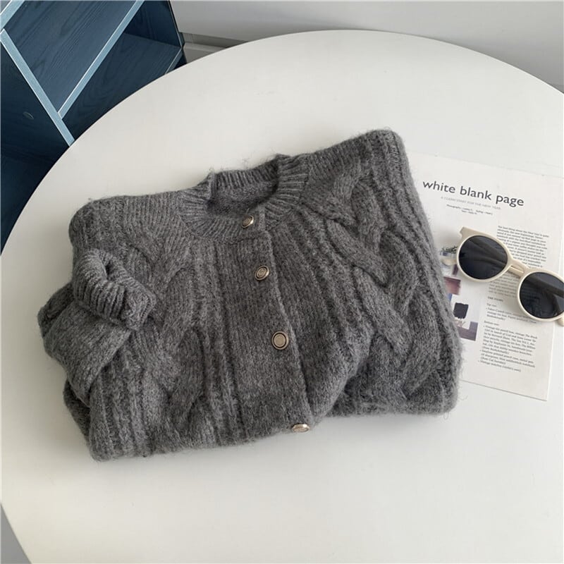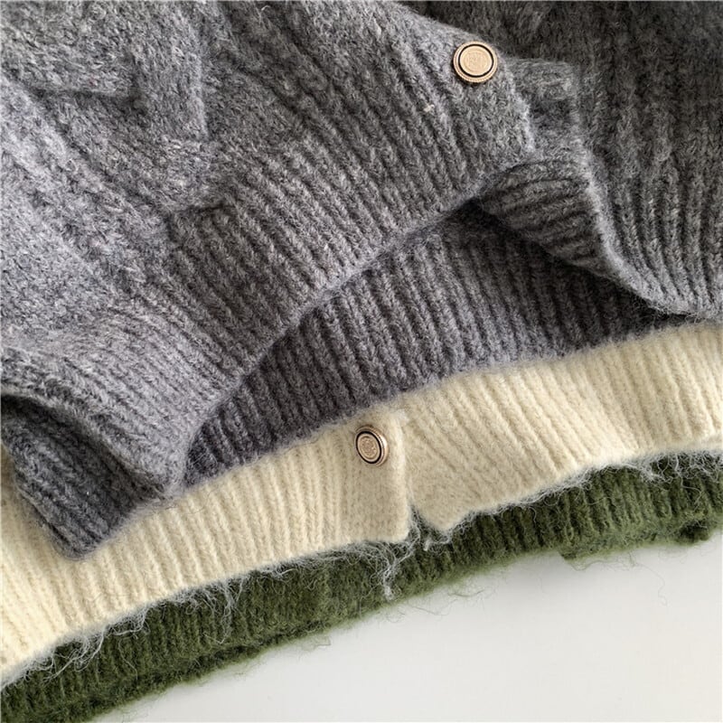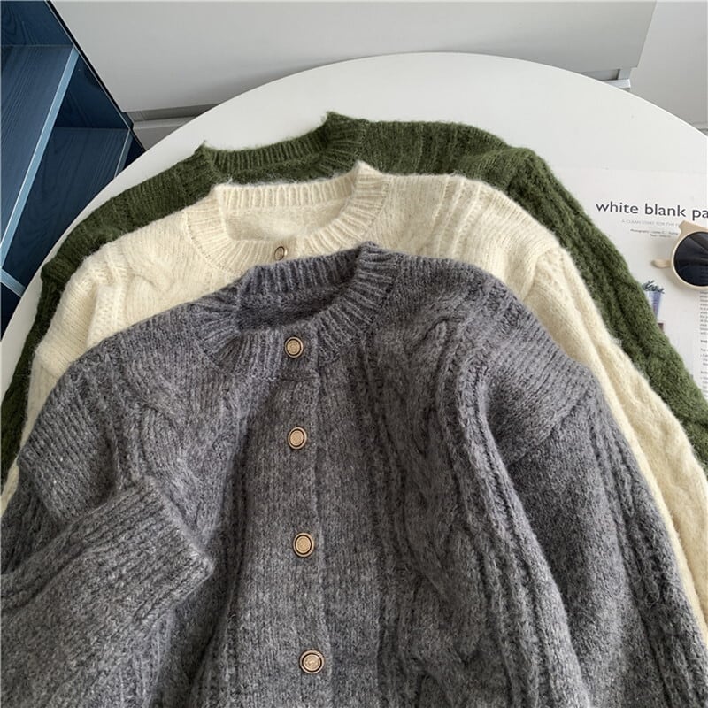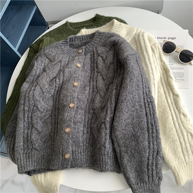 ケーブル編みがレトロな雰囲気もありつつ優しい印象のカーディガン。
