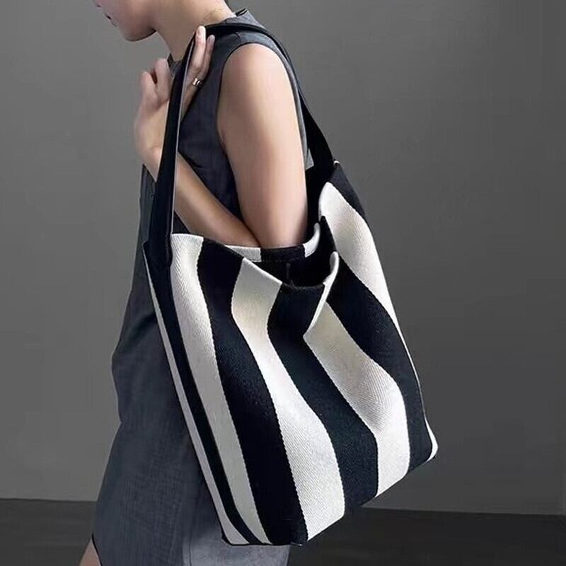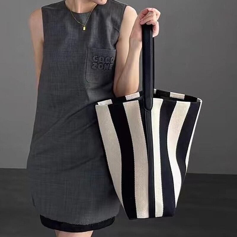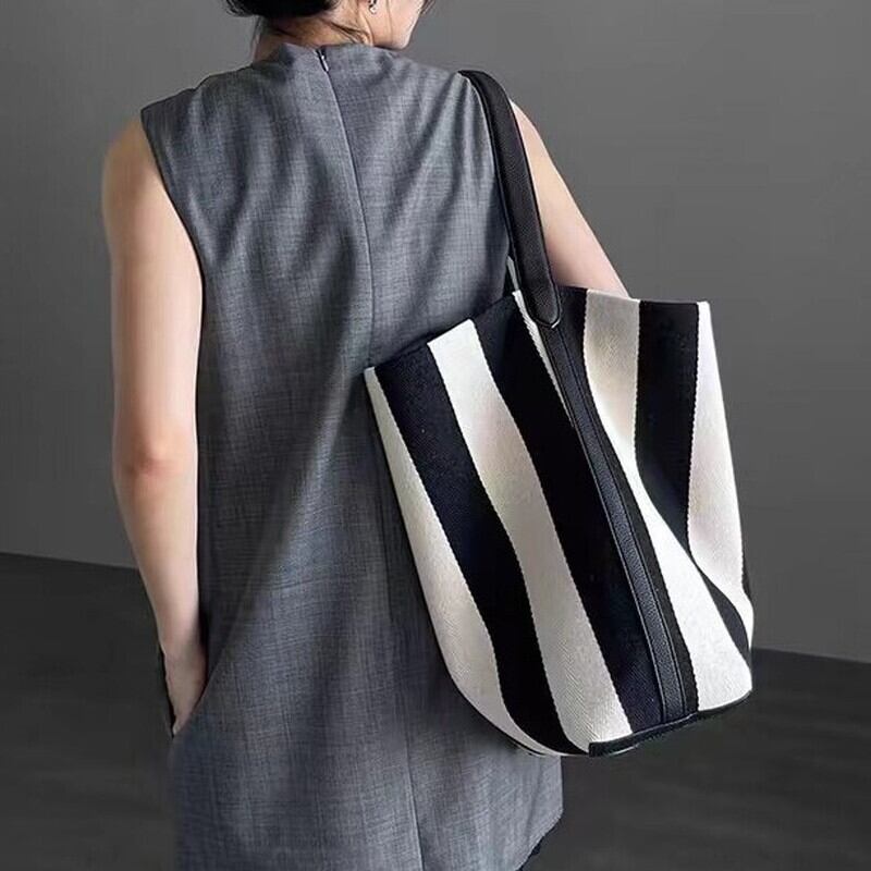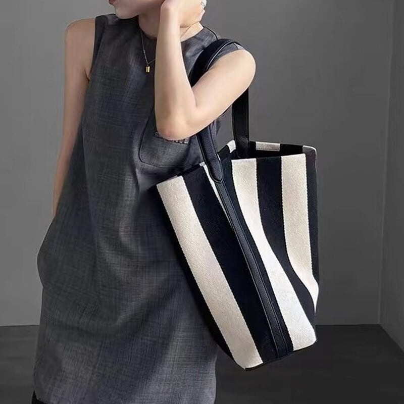 コントラストの効いた大胆なワイドストライプが、装いにモダンなアクセントと都会的な品格を添えるトートバッグ。