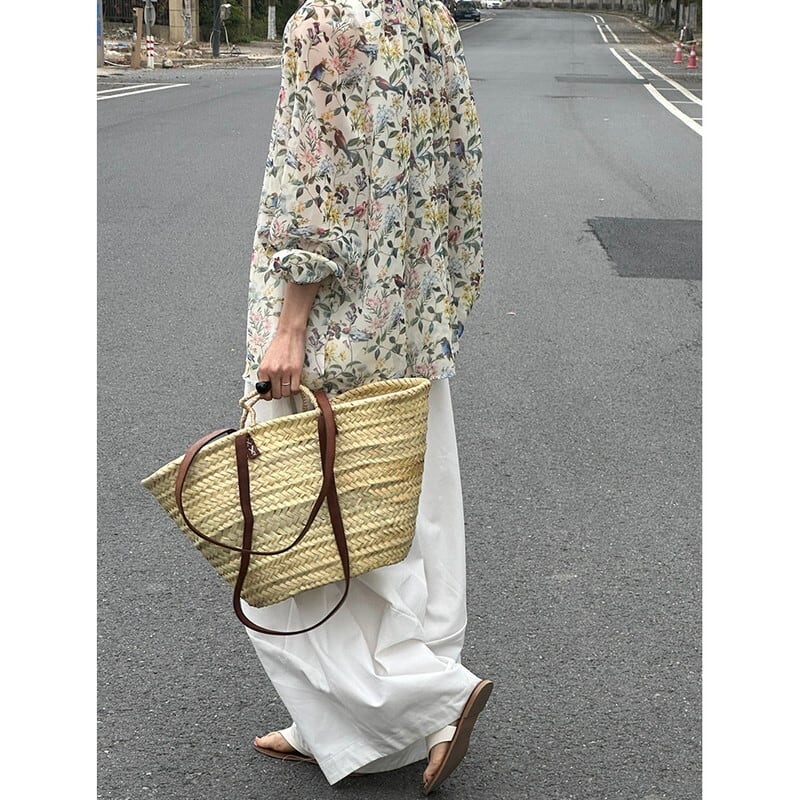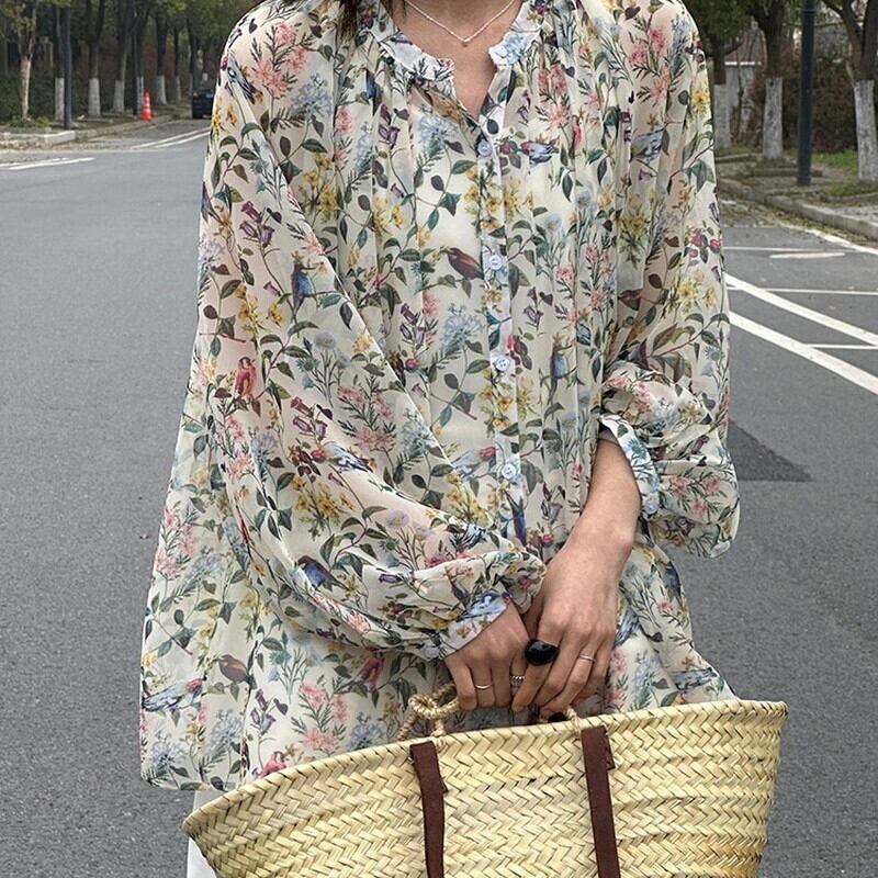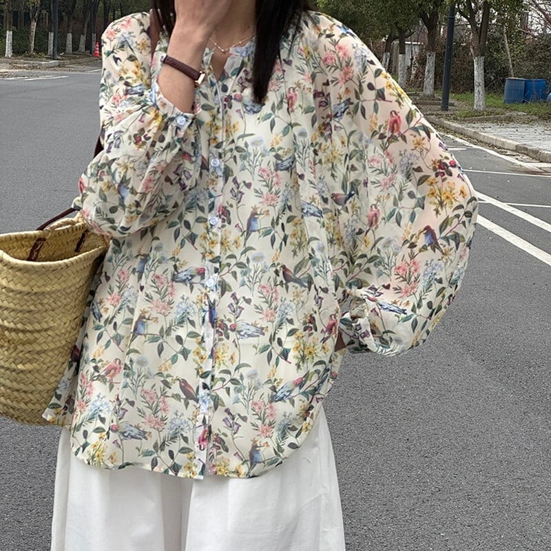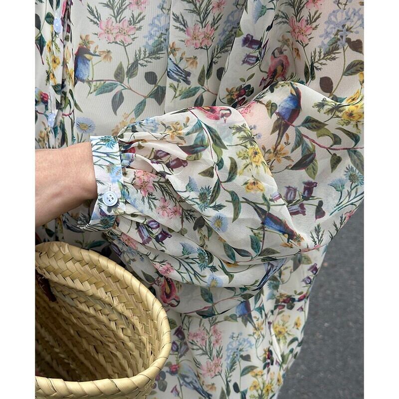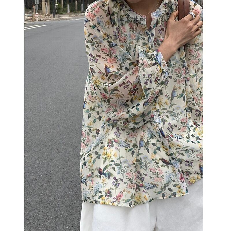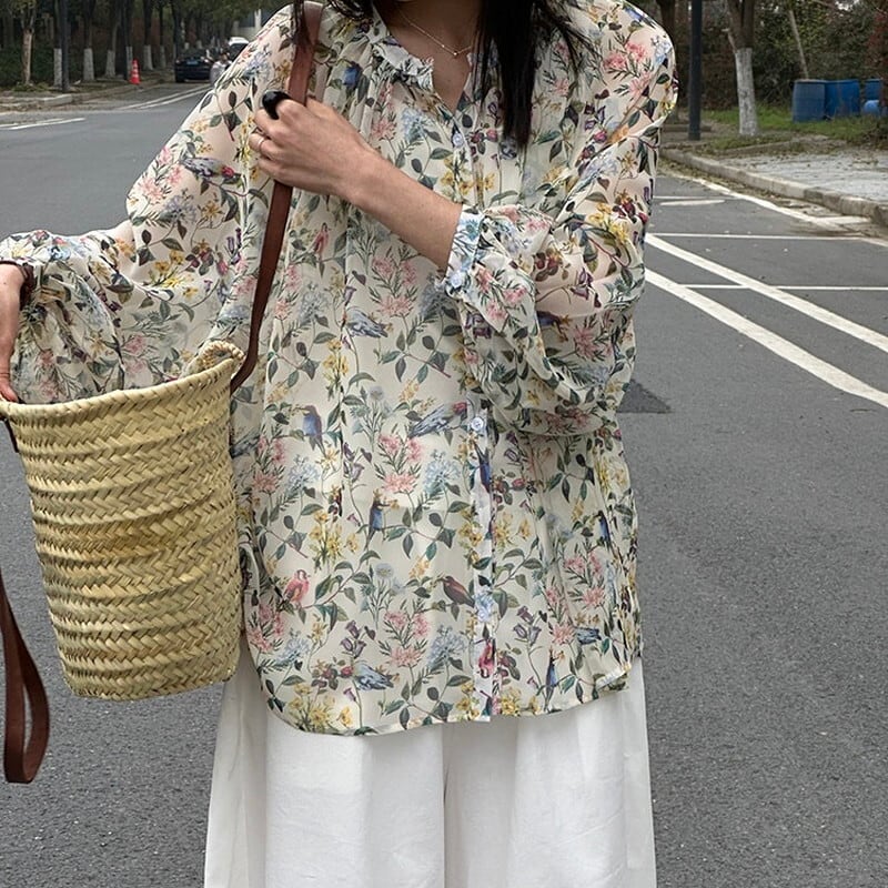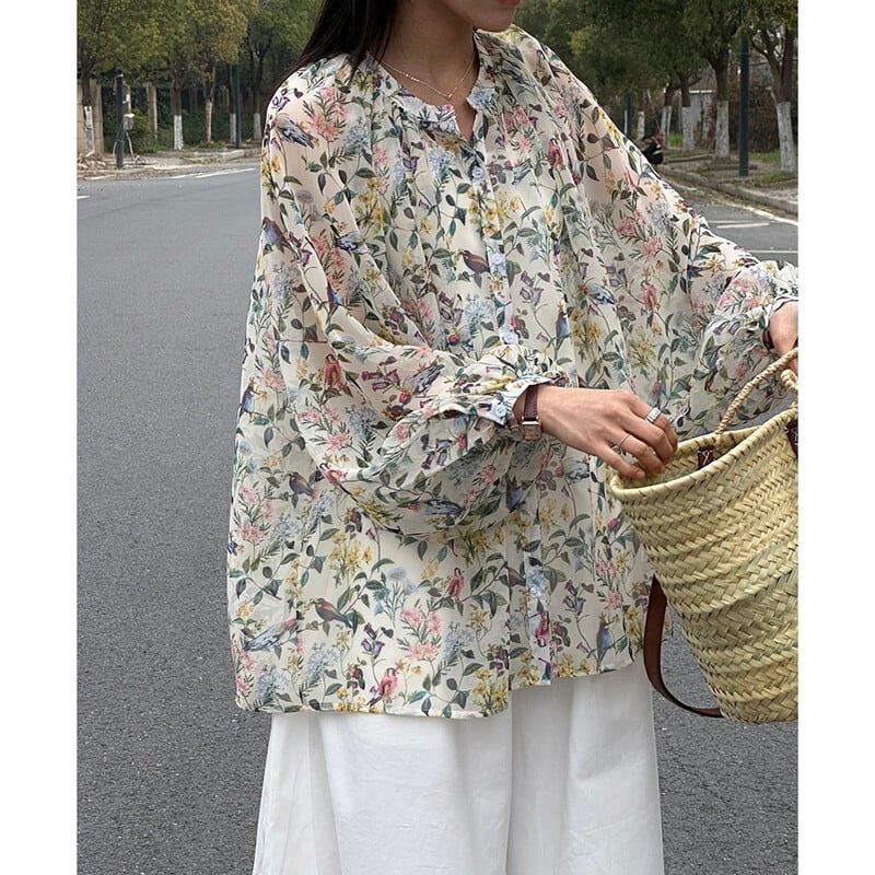 色彩豊かなボタニカル柄が華やかな透け感のあるブラウス。