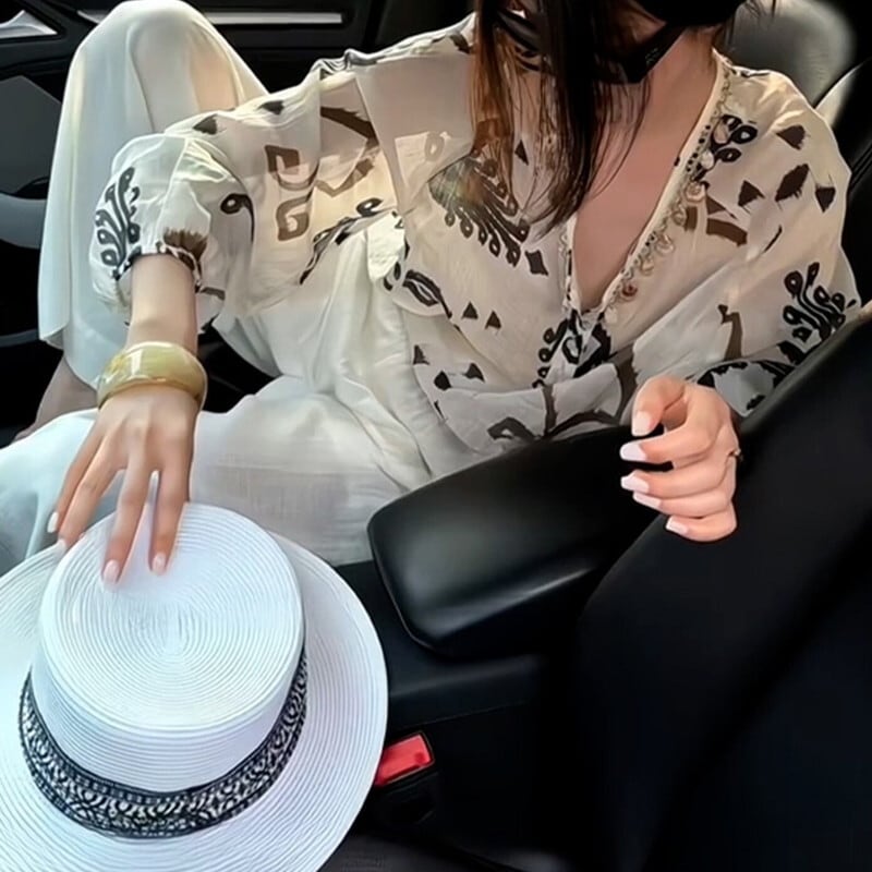 襟元のシャープなVカットと大胆な総柄のデザインが、気になる上半身を自然にカバー。