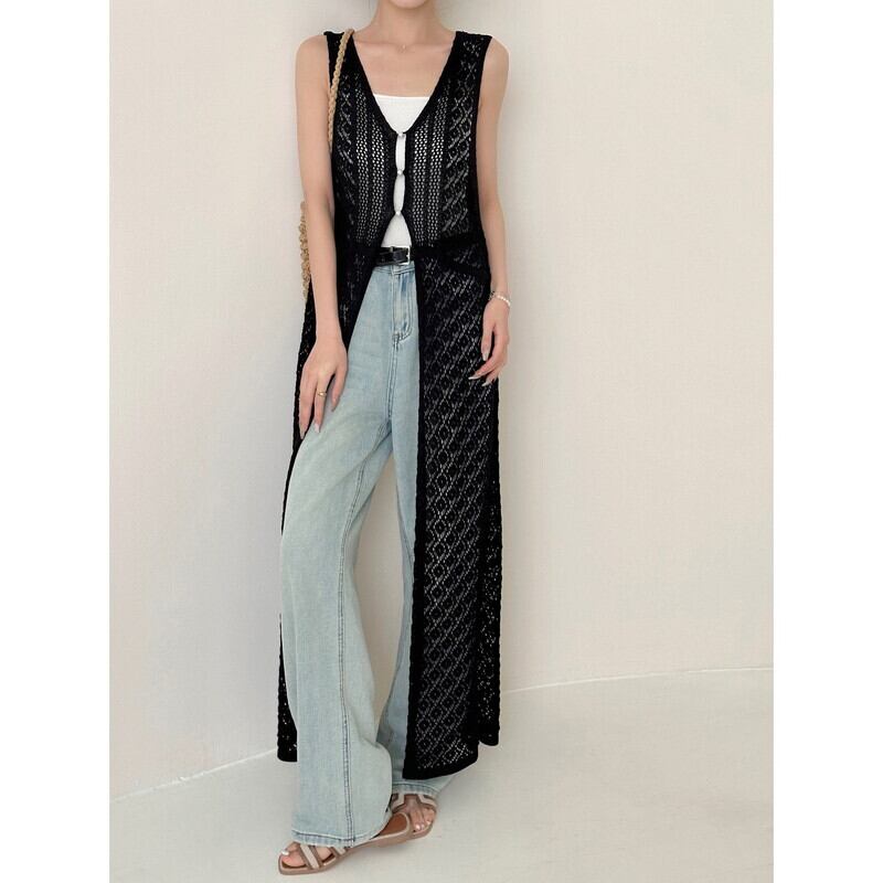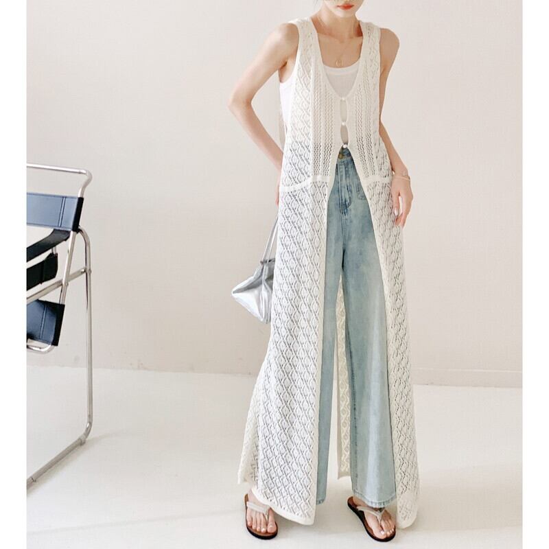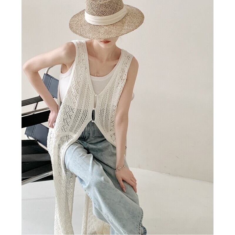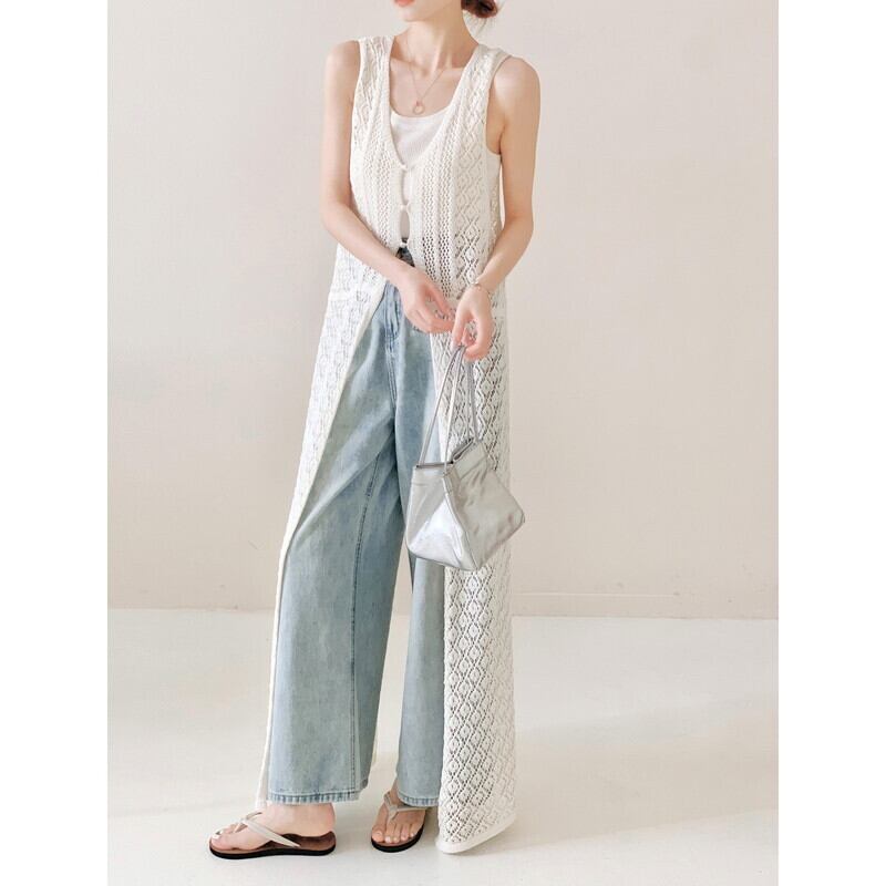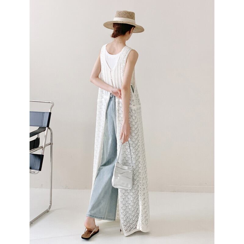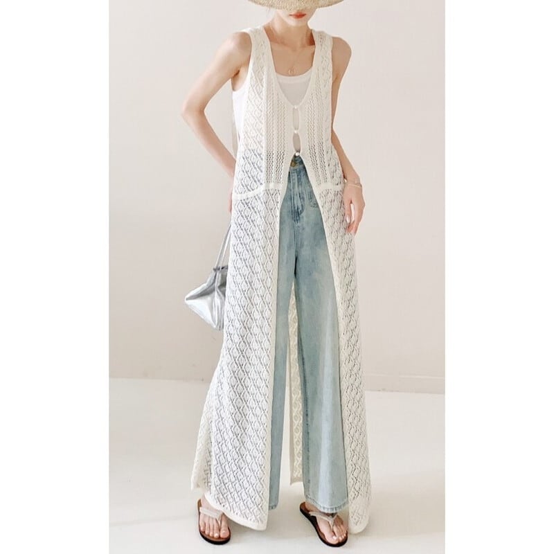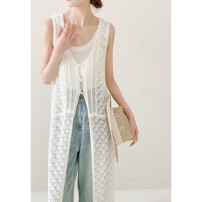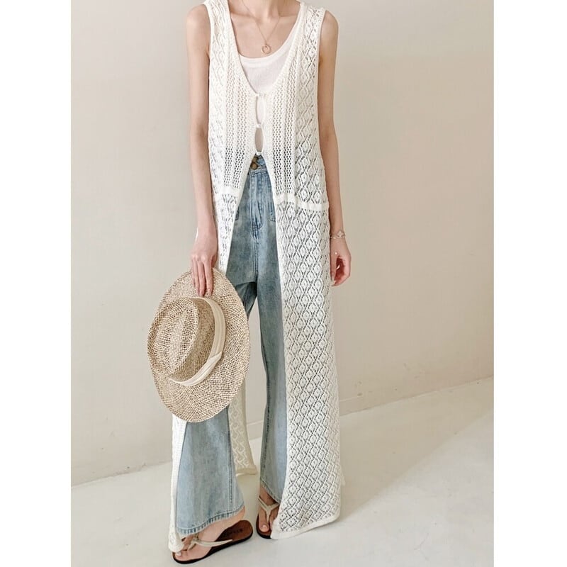 透かし編みがアクセントになった、涼しげなロングベスト。