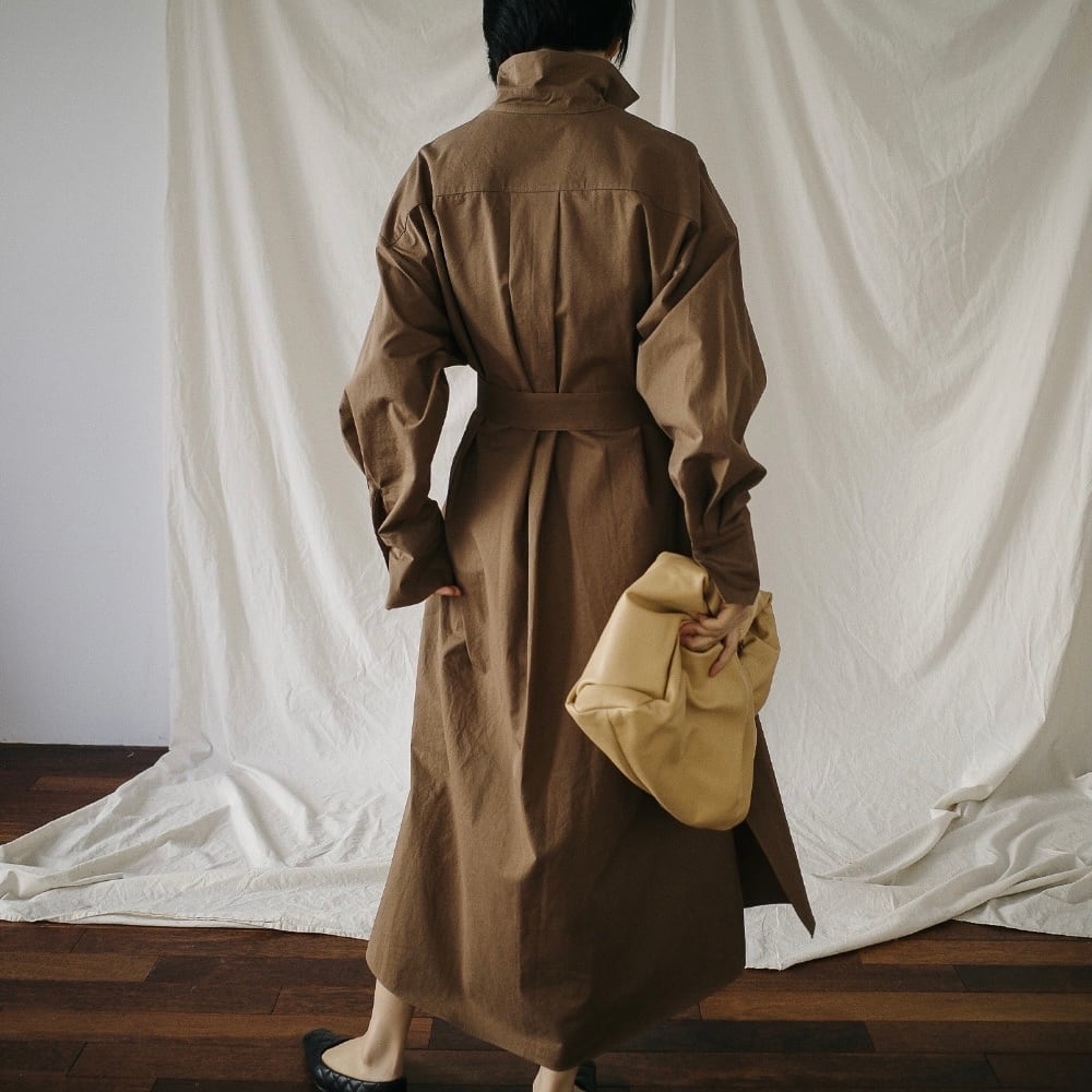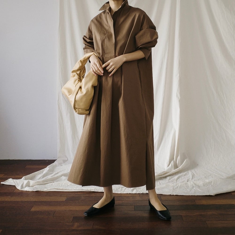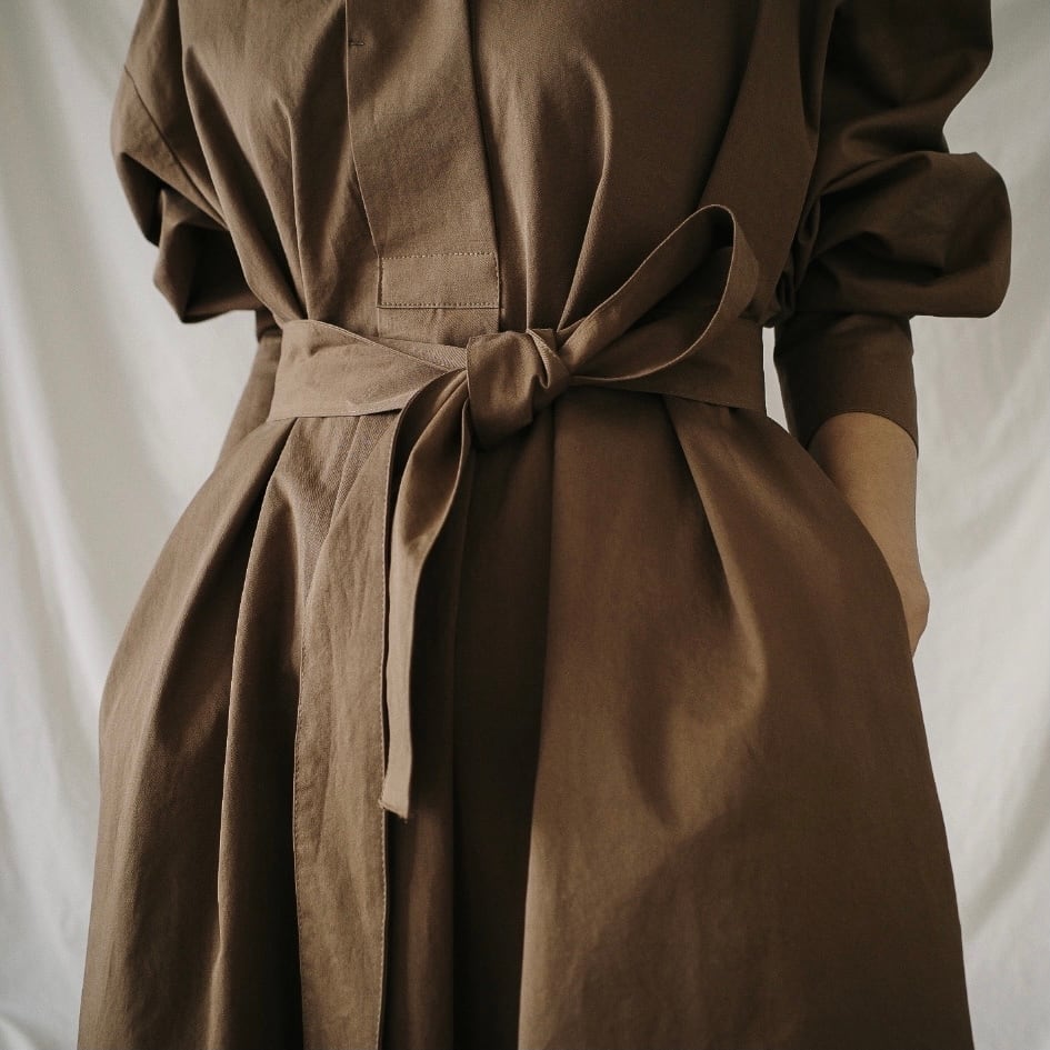 コットンシャツワンピース。シンプルにそのままストンと着ても、ウエストベルトをしても素敵です。暖かい日は1枚で、寒い日はハイネックのインナーやリブレギンスなどをレイヤードしていただくと長いシーズン着ていただけます。