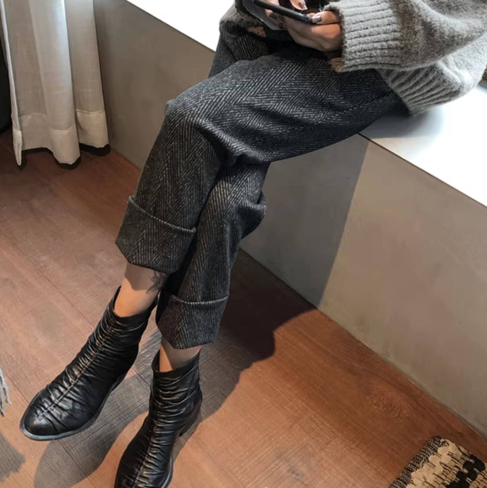 細かいヘリンボーン柄の入ったテーパードパンツ。