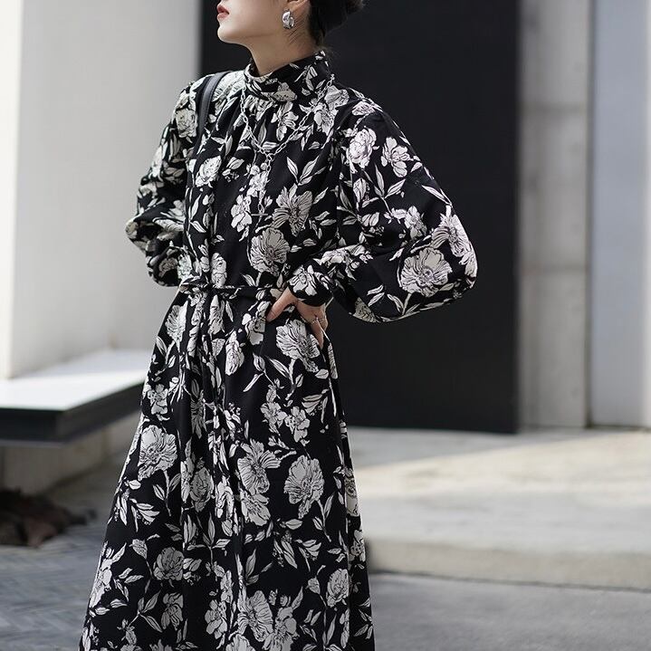 モノトーンの繊細な花柄が大人っぽいロングワンピース。今はニットカーディガンを羽織って、春には1枚で長く着ていただけるワンピースです。