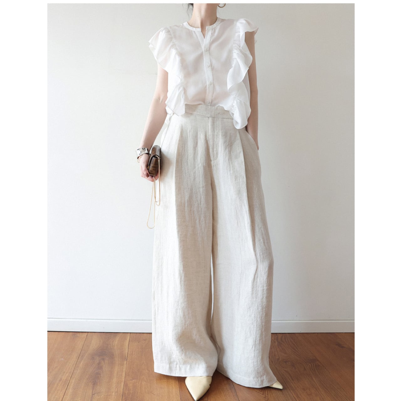 肩からサイドに入ったフリルがシンプルなスタイルに華やかさを加えてくれるブラウス。