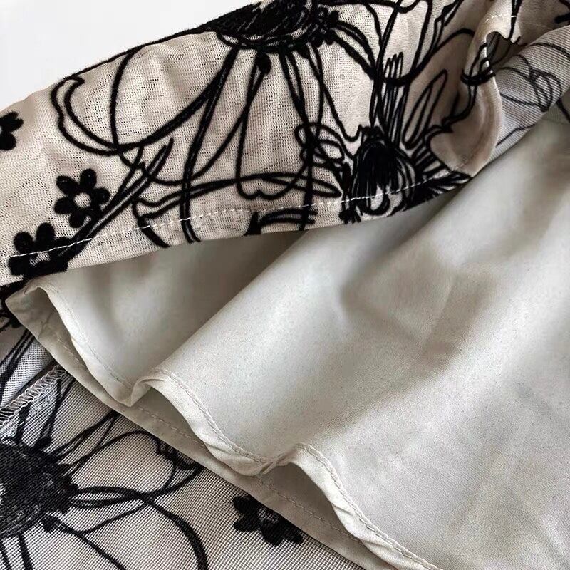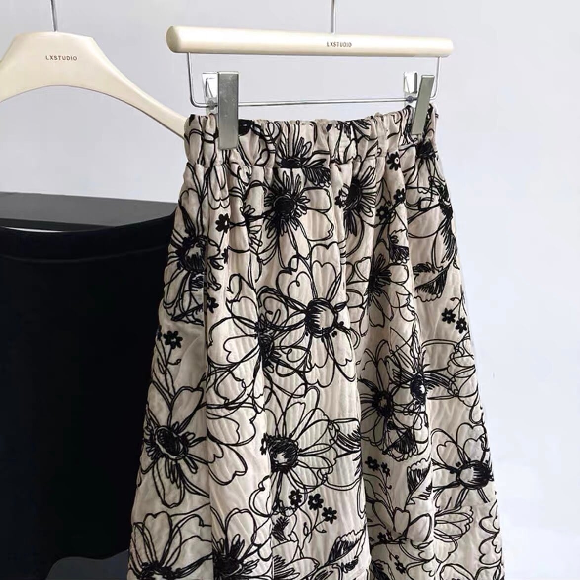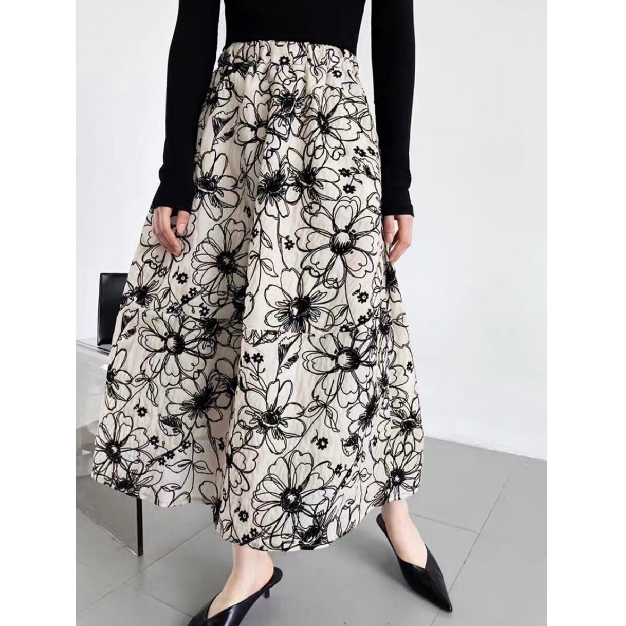 モノトーンの花柄スカート。シンプルながらも美しいデザインで、存在感のある1枚。軽やかな素材が揺れる度に女性らしいシルエットを演出し、歩くたびに華やかさを放ちます。ウエストはゴム仕様で、調節も簡単。着心地も良く、長時間の着用でも疲れません。