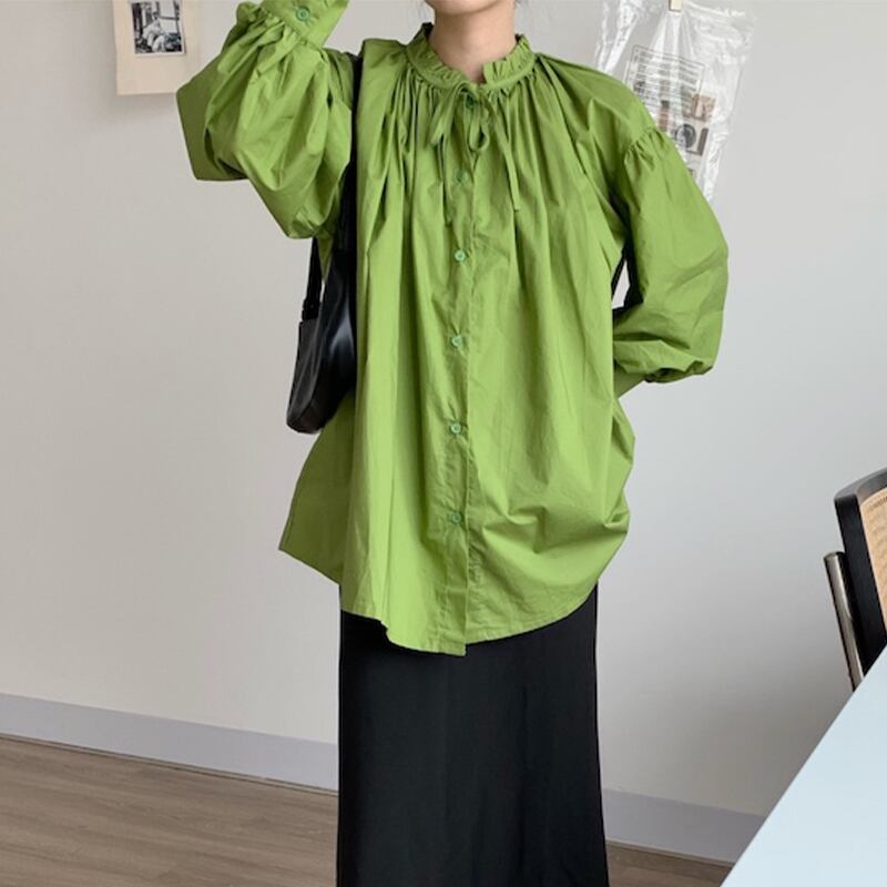 トレンド感あるビビットなカラーでコーディネートを華やかに彩るギャザーブラウス。